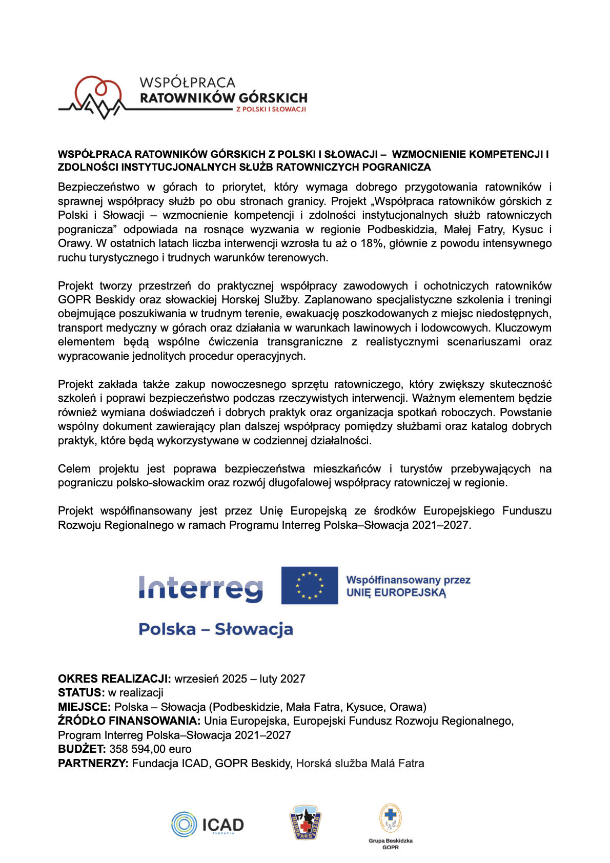 Grupa Regionalna Górskiego Ochotniczego Pogotowia Ratunkowego - Grupa Beskidzka wraz z Województwem Małopolskim i innymi Partnerami realizuje projekt Małopolska Tarcza Antykryzysowa – Pakiet Medyczny II w zakresie bezpieczeństwa. Projekt finansowany jest przez Unię Europejską z Europejskiego Funduszu Społecznego w ramach Regionalnego Programu Operacyjnego Województwa Małopolskiego na lata 2014-2020, Działanie 9.2 Usługi społeczne i zdrowotne, Poddziałania 9.2.1 Usługi społeczne i zdrowotne w regionie, typ projektu F. Rozwój usług zdrowotnych i społecznych ukierunkowanych na walkę z epidemią COVID-19. Głównym celem realizowanego projektu jest wsparcie służb i jednostek działających na rzecz bezpieczeństwa i ratownictwa w województwie małopolskim, realizujących działania w zakresie zapobiegania, przeciwdziałania i zwalczania COVID-19. Projekt ma zapewnić odpowiednie zasoby środków ochronnych dla służb do prowadzenia działań związanych z pandemią wywołaną koronawirusem SARS-CoV-2. Efektem realizacja projektu będzie zwiększenie skuteczności reagowania podmiotów w walce z koronawirusem jak również poprawa warunków pracy służb działających na rzecz bezpieczeństwa i ratownictwa w Małopolsce.